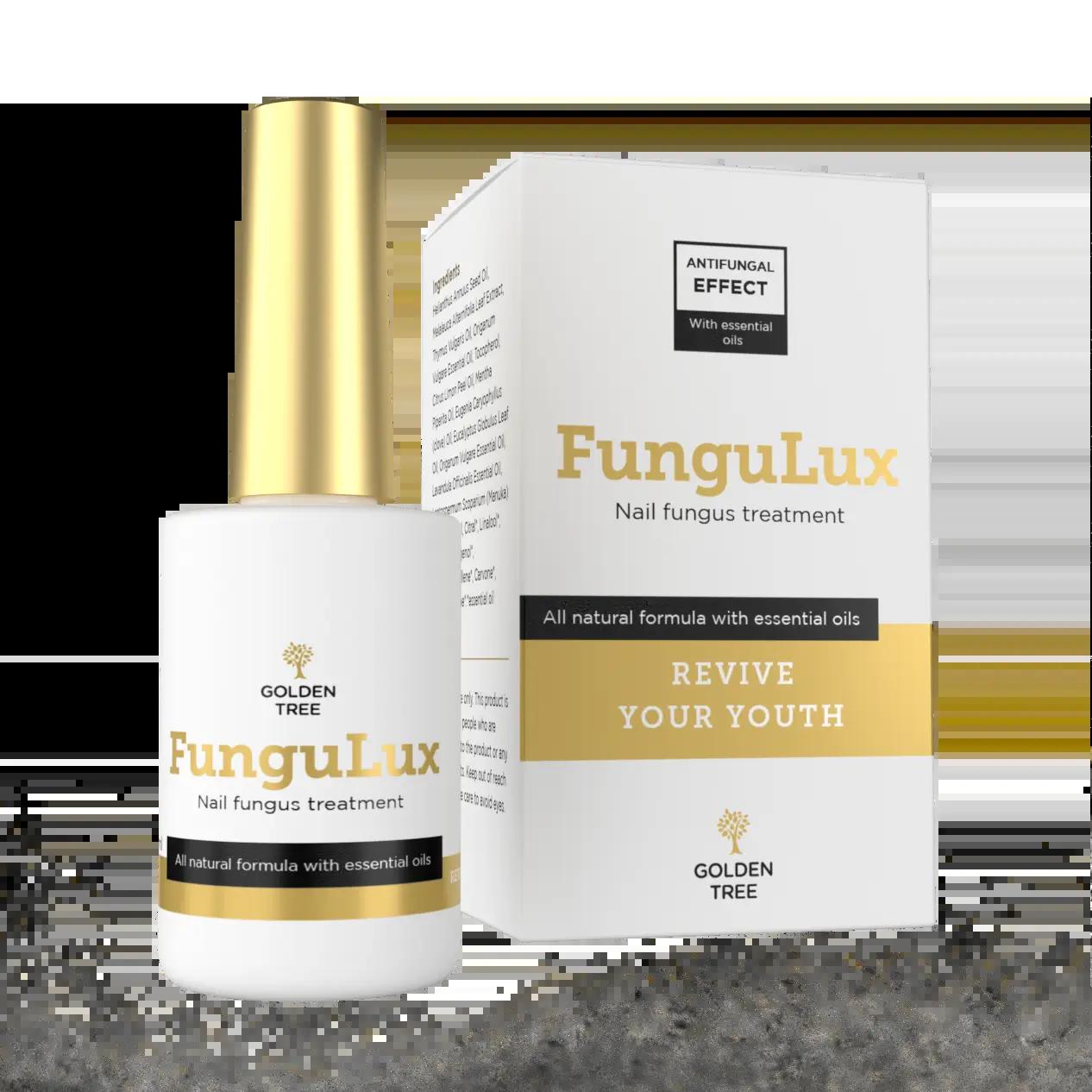 FunguLux UK is a topical nail fungus treatment designed to support healthier nails and skin. Unlike oral supplements, this product is applied directly to the affected area, allowing targeted action. The product shown highlights its antifungal effect and emphasizes an all-natural formula with essential oils, making it appealing to those seeking gentle yet effective care. Manufactured under the brand “Golden Tree,” FunguLux is positioned as a solution that combines nature and science to restore nail vitality.